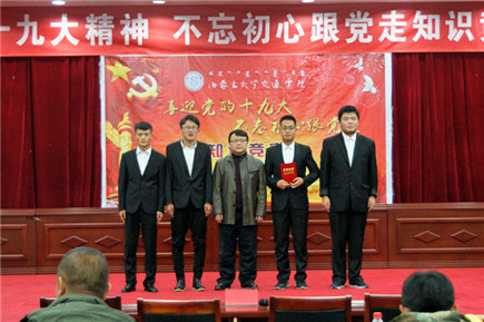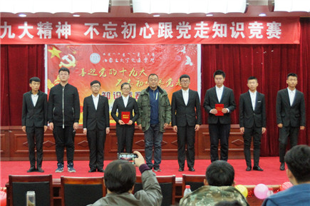 郭鵬飛代表黨群工作部和學(xué)生工作處(團(tuán)委)總結(jié)點(diǎn)評本次活動。他首先祝賀本次競賽活動取得圓滿成功,祝賀所有參賽選手在活動中得到巨大的知識和精神上的收獲。他指出,在我院持續(xù)掀起學(xué)習(xí)貫徹宣傳黨的十九大精神熱潮時,主題知識競賽活動無疑起到了薪添旺火的作用,題庫設(shè)計量大面廣點(diǎn)全,準(zhǔn)備工作非常充分,競賽選手的臨場表現(xiàn)和發(fā)揮集中體現(xiàn)了我院學(xué)生朝氣蓬勃的青春力量和堅定執(zhí)著地共產(chǎn)主義理想信念。他強(qiáng)調(diào),青年學(xué)生是祖國和民族未來的希望,一定要懷著“不忘初心跟黨走、青春建功新時代”的執(zhí)著信念,把個人的理想追求融入國家和民族的事業(yè)中,從自身成長和社會發(fā)展進(jìn)步兩個角度全面把握培育和踐行新時代青年的內(nèi)在要求。學(xué)院會為青年大學(xué)生對習(xí)近平新時代中國特色社會主義思想的學(xué)習(xí)貫徹宣傳創(chuàng)造更多有利條件,學(xué)院已經(jīng)在學(xué)生中成立了青年馬克思讀書會,還將成立學(xué)習(xí)習(xí)近平新時代中國特色社會主義思想學(xué)生研究會和十九大精神學(xué)生宣講團(tuán)。他號召全院學(xué)生要把握歷史機(jī)遇,肩負(fù)偉大的歷史責(zé)任,用自己的實際行動將個人夢和中國夢相結(jié)合,腳踏實地,奮力前行,為實現(xiàn)中華民族偉大復(fù)興中國夢而不斷努力。