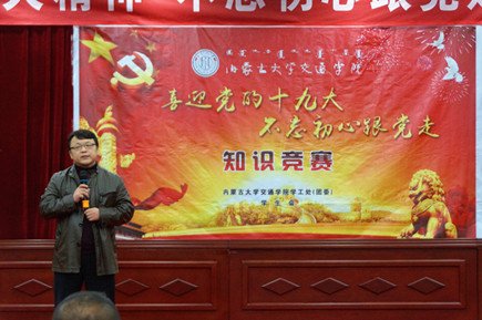 11月15日晚7時,由學(xué)工處(團(tuán)委)和黨群工作部共同舉辦的內(nèi)蒙古大學(xué)交通學(xué)院“喜迎黨的十九大,不忘初心跟黨走”主題知識競賽在交通樓A453拉開帷幕。黨群工作部郭鵬飛、學(xué)工處(團(tuán)委)孫立宇出席活動。近300名學(xué)生現(xiàn)場觀摩了競賽。
