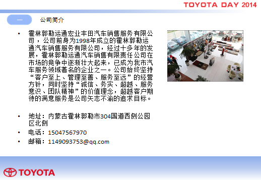 霍林郭勒運(yùn)通宏業(yè)豐田汽車(chē)銷(xiāo)售服務(wù)有限公司 |
