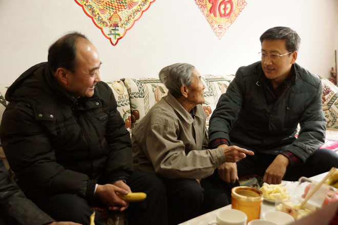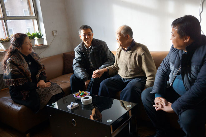 學(xué)院院長(zhǎng)柴金義(左二),黨委副書記、紀(jì)委書記白托婭(左一)慰問(wèn)離休干部李成柏(左三)同志 |