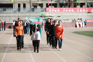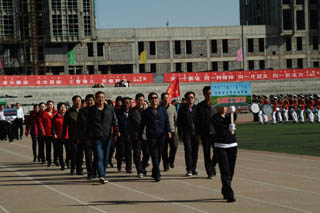 開幕式由黨政辦公室主任胡利春主持,在雄壯高昂的運(yùn)動員進(jìn)行曲中,各系學(xué)生和教工方隊(duì),機(jī)關(guān)、教輔單位職工方隊(duì),步伐矯健,口號響亮,依次走過主席臺接受檢閱。隆重的入場式后,開幕式舉行了莊嚴(yán)的升國旗儀式,在嘹亮的國歌聲中,五星紅旗冉冉升起。