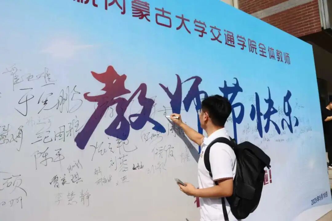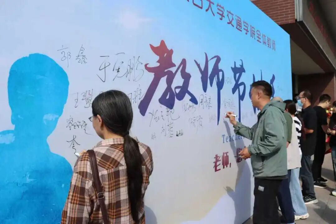 金秋送爽,桃李芬芳。9月10日上午十時(shí),交通學(xué)院慶祝第41個(gè)教師節(jié)“師生送祝?!焙灻麅x式準(zhǔn)時(shí)啟動(dòng)。學(xué)院領(lǐng)導(dǎo)白托婭、高飛、周永良及現(xiàn)場(chǎng)200多名師生在簽名墻上留下筆墨。活動(dòng)正值課間,上千名學(xué)生懷揣感恩之心駐足現(xiàn)場(chǎng),紛紛向自己敬愛的老師鞠躬致意,送上節(jié)日祝福,與老師們合影留念。老師們笑容滿面,互致節(jié)日問候,分享著身為教育工作者的幸福與自豪。